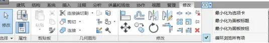 为了使“类型选择器”在“属性”选项板关闭时可用,请在“类型选择器”中单击鼠标右键,然后单击“添加到快速访问工具栏”。要使类型选择器在“修改”选项卡上可用,请在“属性”选项板中单击鼠标右键,然后单击“添加到功能区修改选项卡”。每次选择一个图元,都将反映在“修改”选项卡。