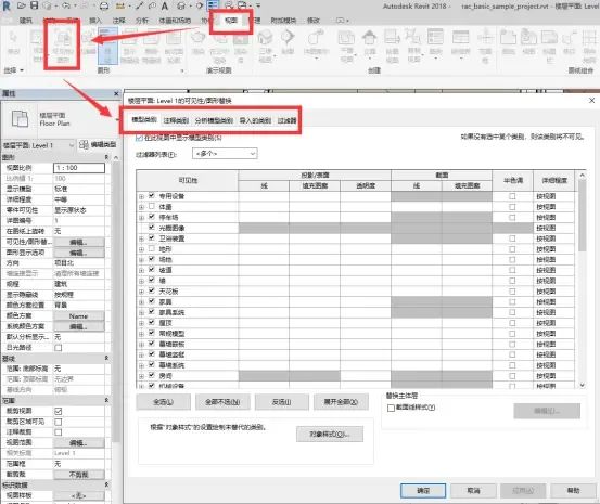 点击“视图”选项卡,点击“可见性/图形”,弹出所在视图的可见性/图形替换对话框,如图所示。