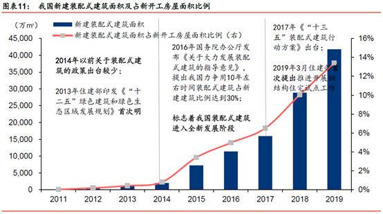 2019年3月:住房城乡建设部首次单独提出推进钢结构住宅试点工作,随后山东、浙江、湖南等地陆续出台试点方案,浙江提出“到2020年,钢结构装配式住宅占新建装配式住宅面积的比例力争达到12%以上”,江西提出“到2022年,全省新开工钢结构装配式住宅占新建住宅比例达到10%以上”,试点方案更加定量。