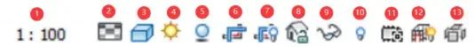 1-13分别为:比例、详细程度、视觉样式、打开/关闭日光路径、打开/关闭阴影、 裁剪视图、显示/隐藏裁剪区域、解锁/锁定的三维视图、临时隐藏/隔离、显示隐藏的图元、临时视图属性、显示分析模型、高亮显示位移集